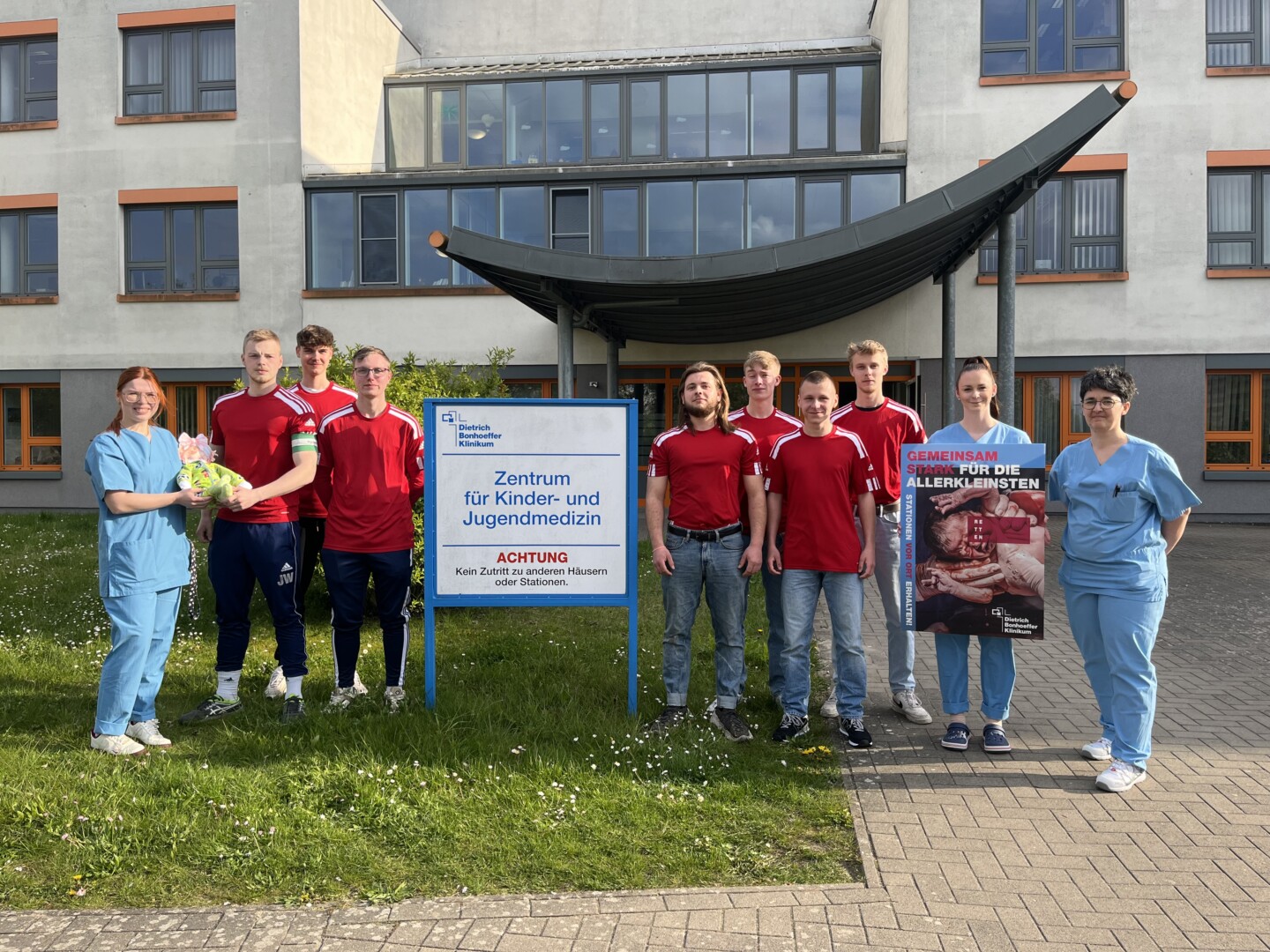 Bild: Johannes Wenda (2.v.l.) und mehrere Spieler seiner Fußballmannschaft holten diese Woche am DBK eine Spendenbox für ihr Turnier am 1. Mai ab, die Schwester Mandy Przygodda (rechts) gestaltet hat.