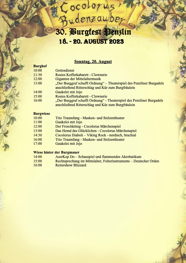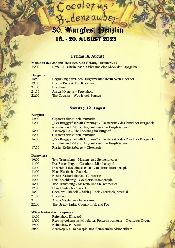Weiterhin erwartet die Besucher ein abwechslungsreiches Bühnenprogramm mit Livebands und Tanzdarbietungen. Große und kleine Gäste können sich wieder vielseitig ausprobieren. Im Burghof tafelt wie in jedem Jahr der Penzliner Burgadel und wartet kurzweilig mit seinem neuen Motto auf: „Der Burggraf schafft Ordnung“.