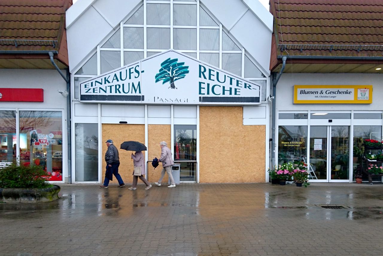Sie sollen im September gleich zweimal mit einem Auto in das Einkaufszentrum Reutereiche hineingefahren sein, natürlich ohne die Tür zu öffnen. Die Spuren sind noch immer zu sehen. Die Einbrecher wollten einen Geldautomaten „knacken“, scheiterten aber an dem Automaten. Eine Nacht später –draußen hielt ein Wachmann Wache im Auto – kamen die Einbrecher wieder. Sie betäubten den Wachmann und fuhren wieder hinein, wobei sie aber wieder nicht zum Zuge kamen. Diesmal ging wohl ihr Auto aus.