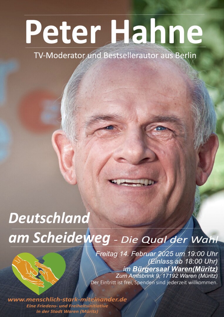 Auf Einladung der „Initiative Menschlich-Stark-Miteinander“ wird der TV-Moderator und Bestsellerautor Peter Hahne am kommenden Freitag, 14.Februar, in Waren zu Gast sein. Unter dem Titel „Deutschland am Scheideweg – Die Qual der Wahl“ will er einen kritischen Blick auf unser Land und die bevorstehende Bundestagswahl werfen.
