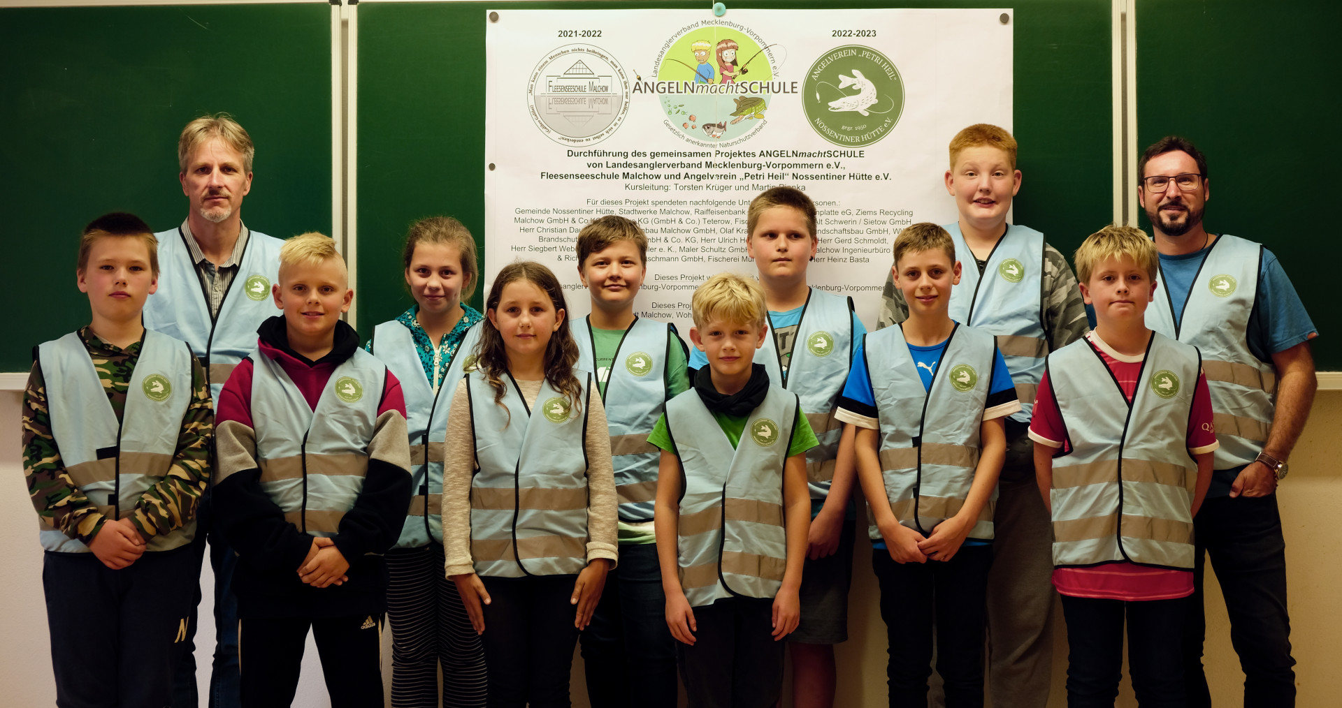 Frei nach Johann Heinrich Pestalozzi gilt hier der Grundsatz: „Lernen mit Kopf, Herz und Hand.“ Nach den Schnupperwochen konnte der Angelverein „Petri Heil“ Nossentiner Hütte e. V, der die Schule bei diesem Projekt unterstützt, zehn Teilnehmern die Zusage geben und nach anfänglichen organisatorischen Dingen gleich in die erste große Thematik der Gerätekunde einsteigen. In diesem Schuljahr sind zwei Mädchen und acht Jungs mit dabei, um sich naturwissenschaftlich weiterzubilden. Am Ende des Schuljahres haben sie wieder die Möglichkeit, an einer Fischereischeinprüfung teilzunehmen und somit die Chance auf einen lebenslang gültigen Fischereischein haben.