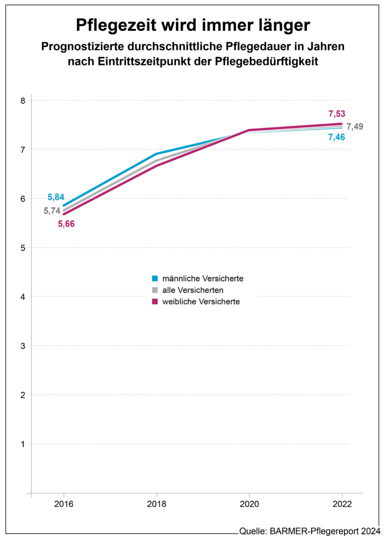 Laut Pflegereport wird sich die Pflegedauer in Deutschland dramatisch erhöhen. Bei kürzlich verstorbenen Pflegebedürftigen lag sie noch bei durchschnittlich 3,9 Jahren. Bei aktuell pflegebedürftigen Menschen wird sie sich nach Barmer-Berechnungen im Schnitt mit 7,5 Jahre nahezu verdoppeln. „Durch die Einführung des neuen Pflegebedürftigkeitsbegriffs im Jahr 2017 haben viele Menschen erstmals Leistungen der Pflegekassen erhalten, die diesen Anspruch vorher nicht gehabt hatten. Die Pflegedauer wurde dadurch erheblich verlängert, und die Kosten wurden deutlich erhöht“, sagt Studienautor Prof. Dr. Heinz Rothgang von der Universität Bremen.