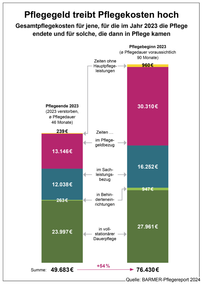 Kürzlich verstorbene Pflegebedürftige hätten bei den Pflegekassen Leistungen im Wert von durchschnittlich 50.000 Euro beansprucht. Bei den aktuell Pflegebedürftigen würden diese Kosten bei rund 76.000 Euro liegen. Dieser Anstieg resultiere vor allem aus dem vermehrten Pflegegeldbezug, der sich als ein zentraler Kostenblock von 13.100 Euro auf 30.300 Euro mehr als verdoppele. Der tatsächliche, künftige Gesamtbetrag aller Leistungen könne sogar noch höher liegen als die prognostizierten 76.000 Euro, weil dieser Summe die Kosten für Pflegeleistungen des Jahres 2023 zugrunde lägen. Die Inflation und mögliche weitere Preissteigerungen seien dabei noch nicht berücksichtigt.