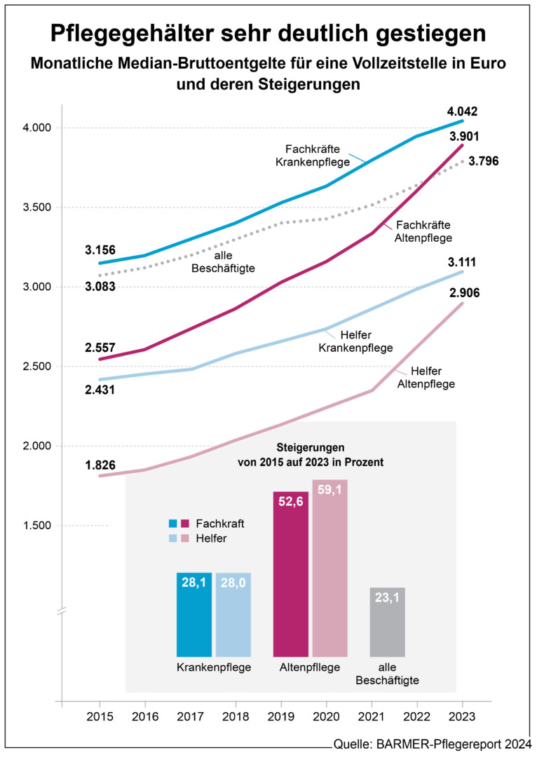 „Die Versicherten könnten bei den Eigenanteilen aber auch entlastet werden, indem die Bundesländer die Investitionskosten für die Infrastruktur der Pflegeheime stärker übernehmen würden“, sagt Rothgang. Ein Grund für die wachsenden Eigenanteile seien gestiegene Löhne. In der Altenpflege seien sie in den Jahren 2015 bis 2023 um 59 Prozent bei Hilfskräften und um 53 Prozent bei Fachkräften gestiegen. Das sei mehr als doppelt so viel wie bei allen Beschäftigten mit einem Plus von 23 Prozent. „Trotz höherer Löhne herrscht nach wie vor ein Mangel an Pflegefach- und Pflegeassistenzkräften vor. In Anbetracht von mehr pflegebedürftigen Personen und längeren Pflegezeiten wird der Bedarf künftig weiter steigen und diese Problematik somit noch größer. Auf die Politik wartet eine Mammutaufgabe, die spätestens eine neue Regierung nach der kommenden Bundestagswahl in Angriff nehmen muss“, sagt BARMER-Chef Straub.