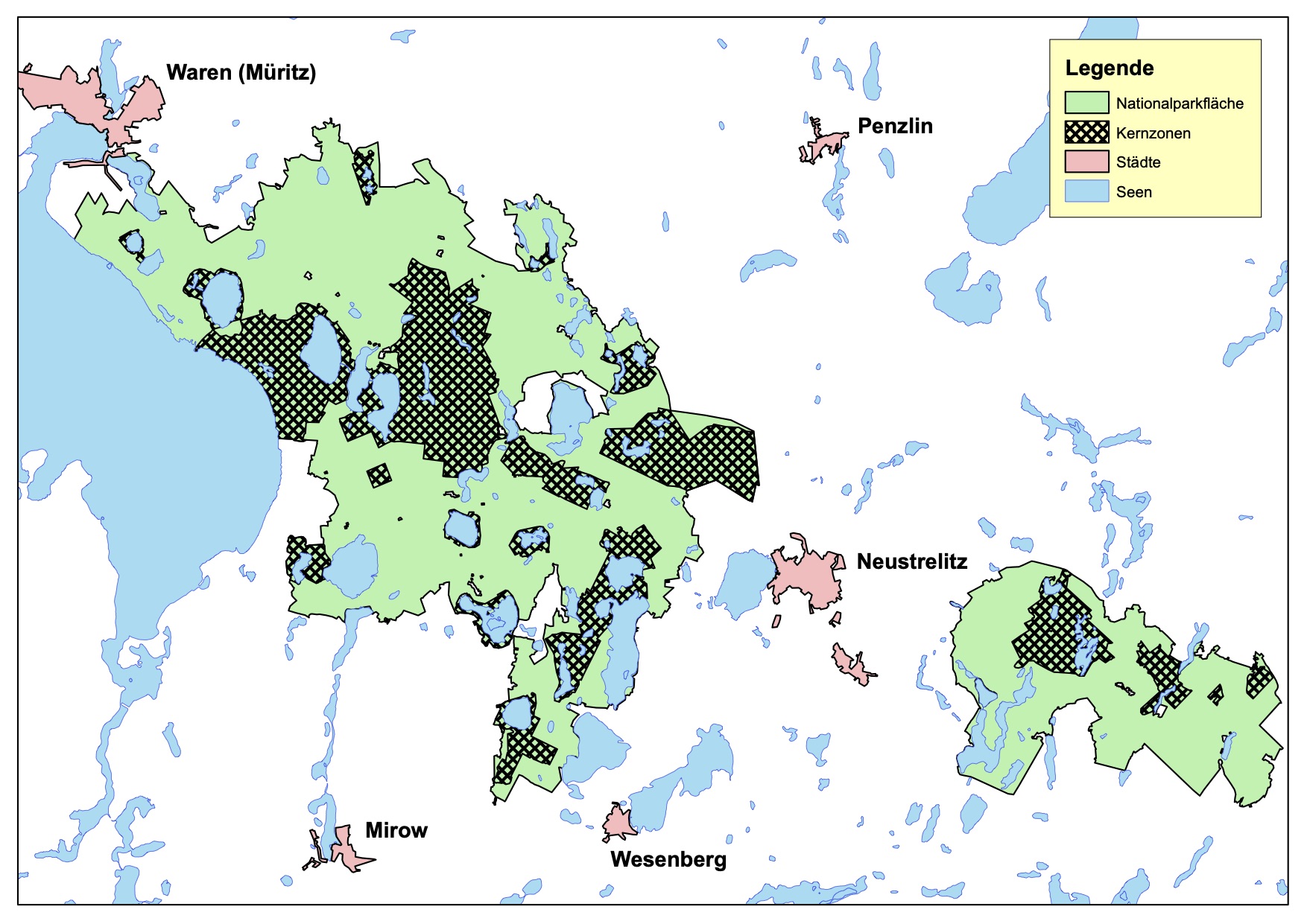 Bild unten: Grobe Karte der Kernzonen im Müritz-Nationalpark