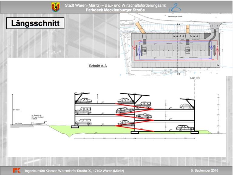Für das Geld gibt’s ein Parkdeck mit sechs Ebenen, was nicht sechs Stockwerken entspricht und sich ob der Höhenunterschiede in der Mecklenburger Straße auch harmonisch in die Landschaft einfügen würde. Im Parkhaus stehen dann 300 Stellplätze zur Verfügung – einige davon auch als feste für Anwohner und Mitarbeiter von Innenstadt-Unternehmen.