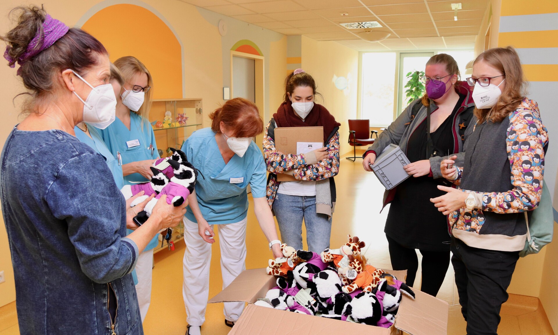 Foto: Sarah Schott (rechts) kam mit zwei Kartons voller Pinguine und Giraffen ins Klinikum.