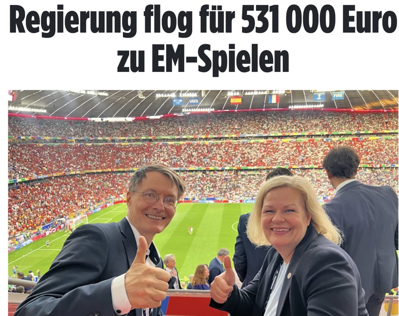 Die Antwort auf die Frage, was sie für die teuren Stadionplätze bezahlt haben: Nichts. Schlimmer noch. Die Politiker haben weitere Kosten produziert, wie aus diesem Bericht hervorgeht: https://www.bild.de/politik/inland/em-2024-regierung-flog-fuer-500-000-euro-zu-spielen-auf-steuerzahler-kosten-669f6388d2fbcb0f92d40a2f