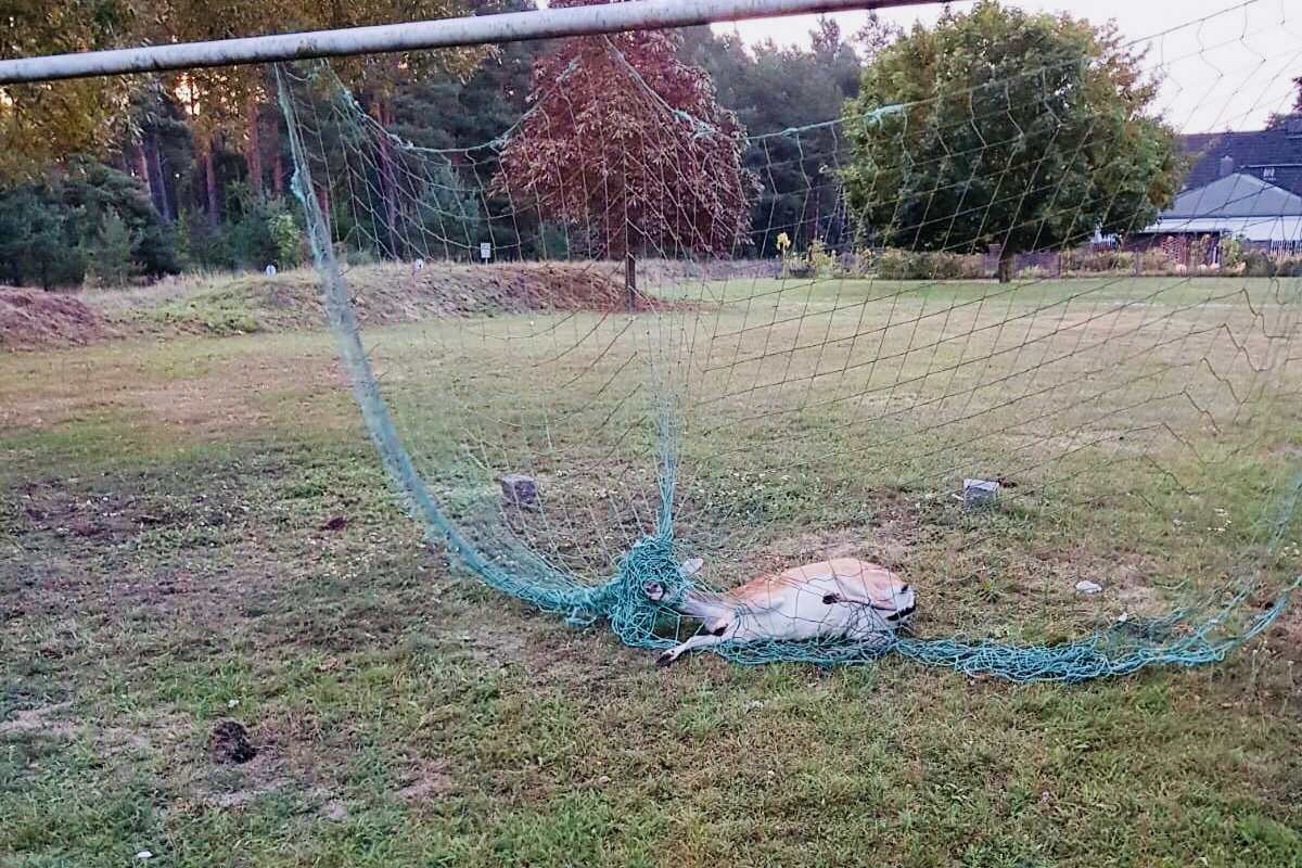 Die Polizisten rückten zu zweit an und trennten das Tornetz kurzerhand auf. Nun müssen die Hoppenwalder das Kunststoffnetz zwar flicken, um wieder den Ball versenken zu können, aber das Wildtier wurde befreit und entkam mit großen Sprüngen Richtung Wald und Truppenübungsplatz zwischen Torgelow und Eggesin.