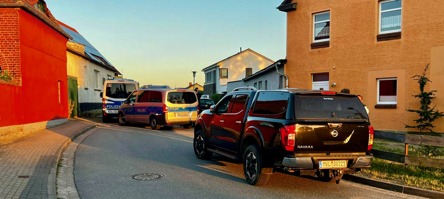 Großer Polizeieinsatz heute Nachmittag in Penzlin: Gegen 16.20 Uhr ging bei der Einsatzleitstelle der Notruf eines Zeugen ein. Er teilte mit, dass ein Mann gerade versucht, bei seiner Nachbarin die Wohnungstür einzutreten. Auch die Nachbarin meldete sich und erklärte, dass sie sich in Gefahr befindet und große Angst hat. Zwei Funkstreifenwagen des Warener Reviers eilten zum Einsatzort. Dort angekommen hatte der aggressive Mann den Tatort bereits verlassen. Laut Angaben der 42-jährigen deutschen Geschädigten hatte er sich zuvor unberechtigt Zugang zum Hof und zum Haus verschafft und mit einer Machete die Wohnungstür beschädigt.