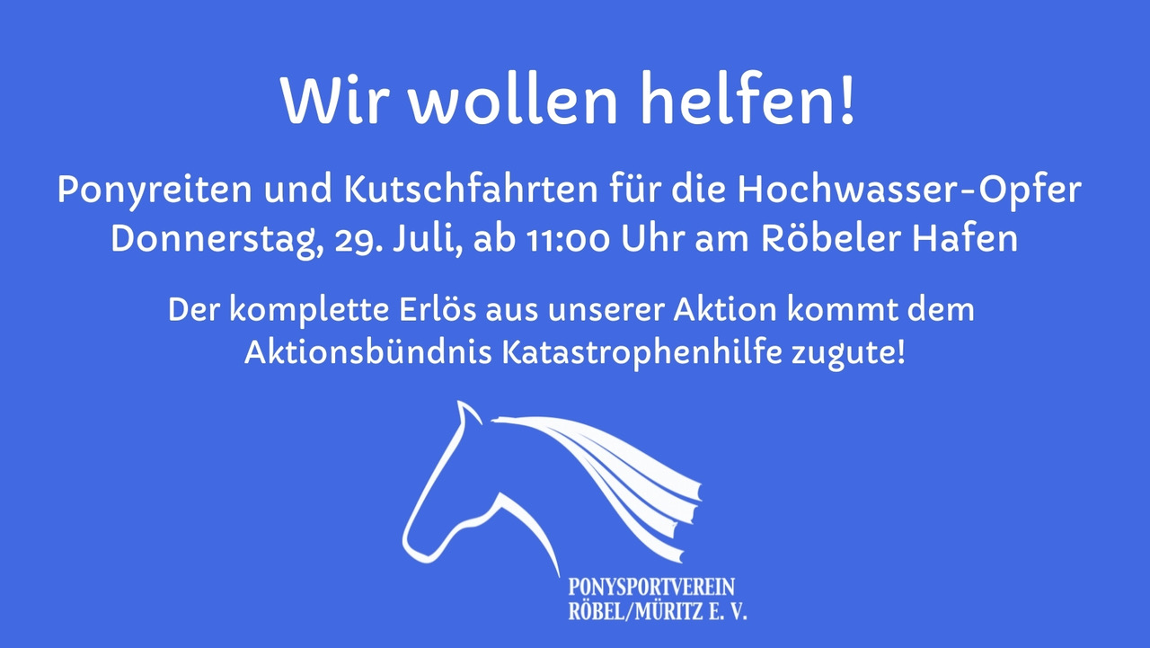 Die Bilder und Nachrichten aus den Hochwassergebieten machen sehr betroffen. Um den Menschen in den von der Hochwasser-Katastrophe betroffenen Gebieten zu helfen, hat der Ponysportverein Röbel/Müritz e.V. kurzfristig beschlossen, eine Spendenaktion durchzuführen.