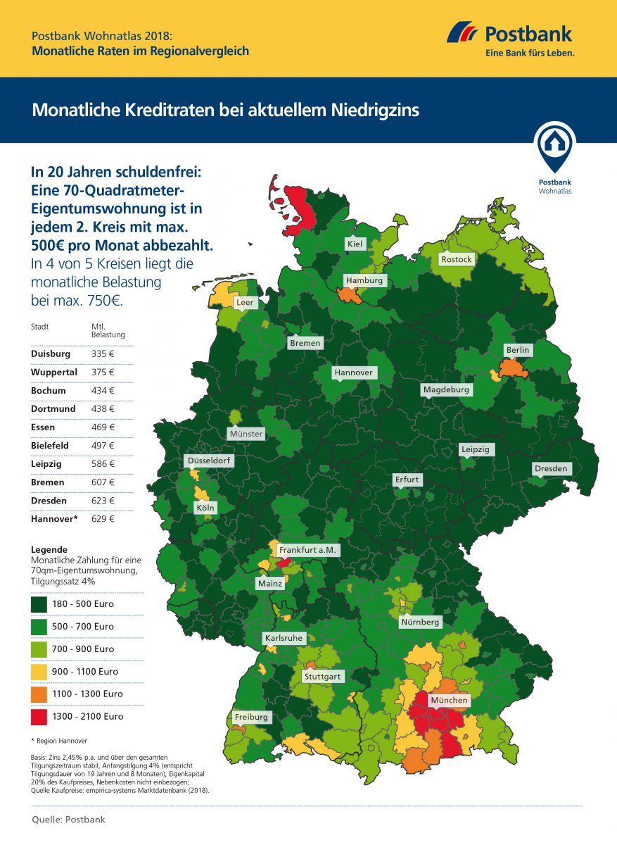 In Deutschland ist die Attraktivität von Wohnimmobilien in den vergangenen Jahren immer weiter gestiegen. Und auch die Preise kennen nur eine Richtung: Im Bundesschnitt steigen sie seit Jahren. Ist der Traum vom Eigenheim noch finanzierbar? Antworten gibt der Postbank Wohnatlas, für den das Hamburger WeltWirtschaftsInstitut (HWWI) die Immobilienmärkte in 401 kreisfreien Städten und Landkreisen untersucht hat. Die Studie zeigt, was der Wohnungskauf monatlich kostet – und wo die Raten im Rahmen bleiben.