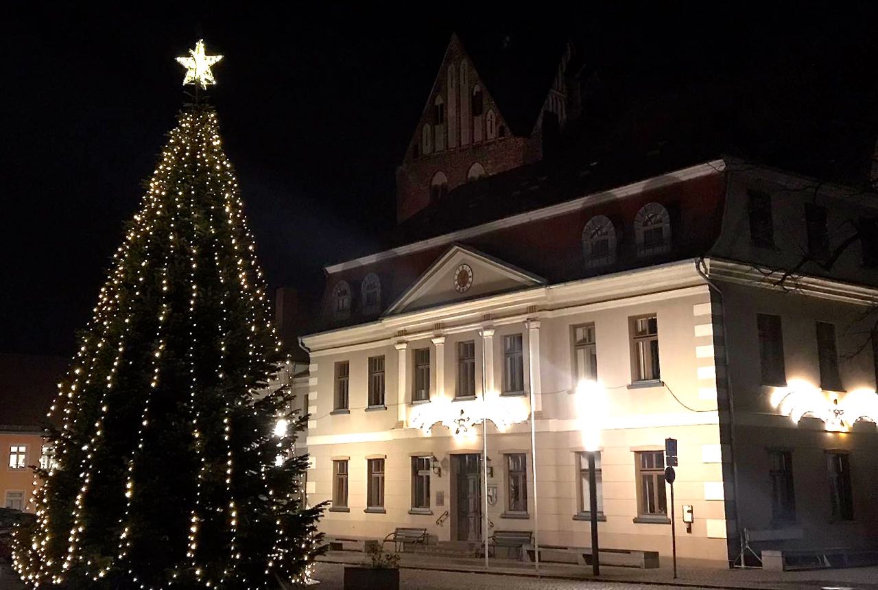 Was für ein Prachtbaum! In Röbel steht seit heute der Weihnachtsbaum auf dem Markt und leuchtet auch schon. Am kommenden Freitag, 29. November, beginnt auf dem Markt dann der kleine, aber feine Weihnachtsmarkt. Aber auch so kann man diesen Anblick genießen. Die rund neun Meter hohe Tanne stammt übrigens von einem Grundstück einer Familie aus Bollewick.