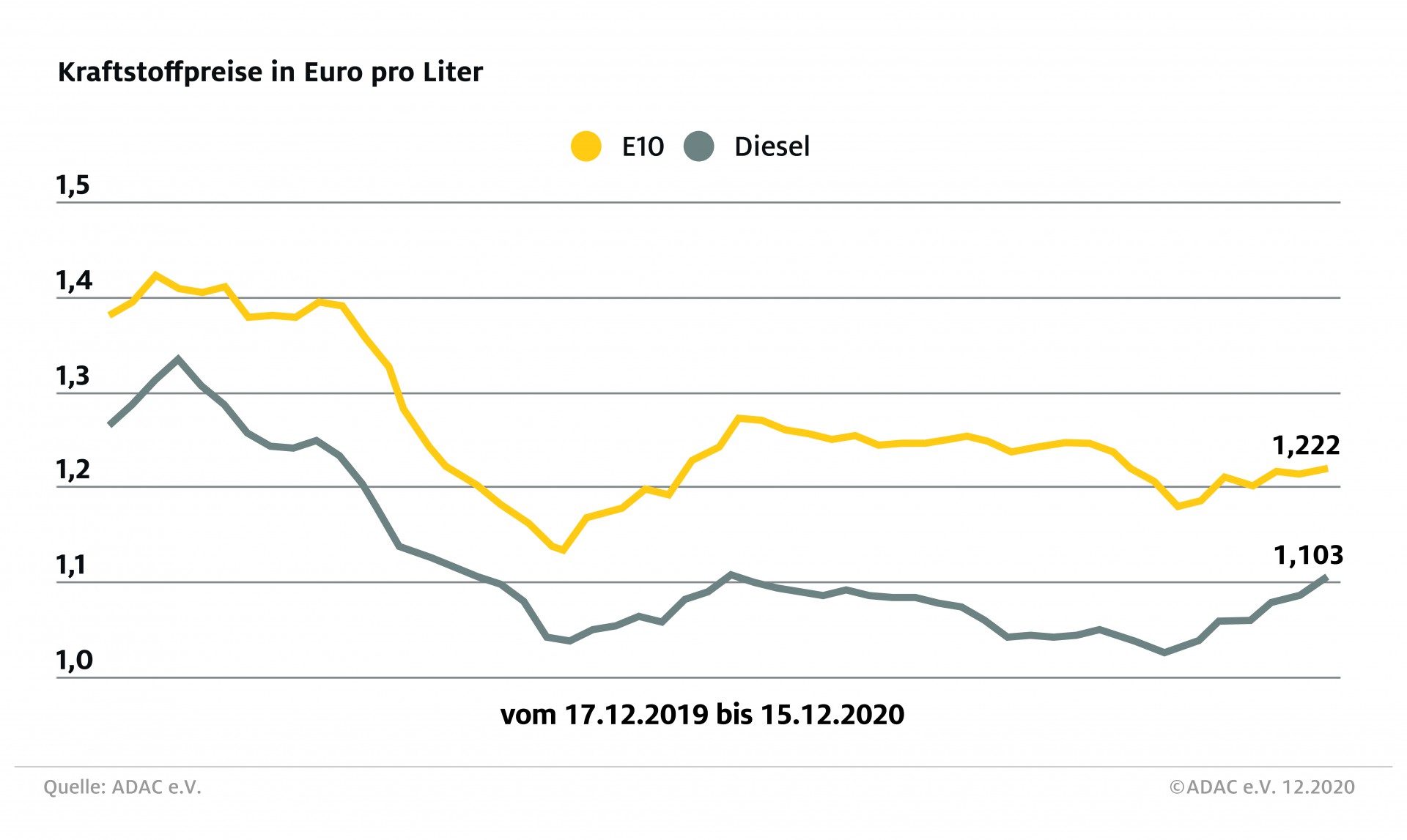 Tanken ist in Deutschland wieder teurer geworden. Vor allem der Preis für Dieselkraftstoff hat binnen Wochenfrist deutlich angezogen. Wie der ADAC mitteilt, kostet ein Liter Diesel derzeit im bundesweiten Mittel 1,103 Euro. Vor einer Woche lag der Durchschnittspreis noch bei 1,088 Euro. Wie die wöchentliche ADAC Auswertung weiter zeigt, kletterte der Preis für Benzin um 0,5 Cent und liegt aktuell bei 1,222 Euro je Liter Super E10.