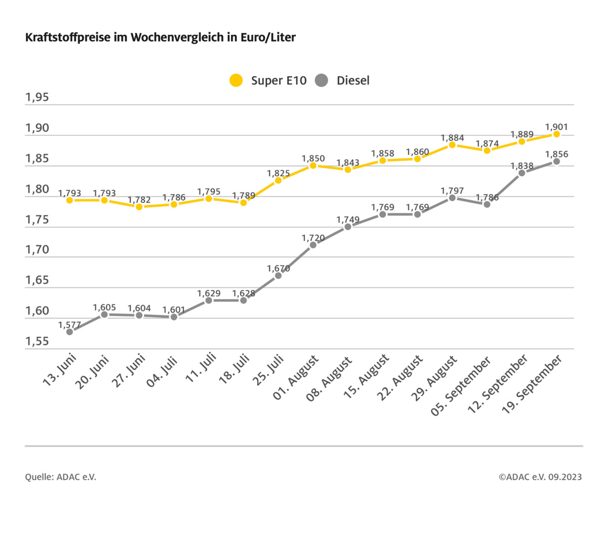 Der Anstieg der Kraftstoffpreise geht auch in dieser Woche weiter. Vor allem Diesel verteuerte sich gegenüber der Vorwoche erneut in stärkerem Maße als Benzin. Dies zeigt die aktuelle ADAC Auswertung. Danach kostet ein Liter des Selbstzünderkraftstoffs im bundesweiten Mittel 1,856 Euro (plus 1,8 Cent). Der Preis für einen Liter Super E10 liegt aktuell im Schnitt bei 1,901 Euro (plus 1,2 Cent).