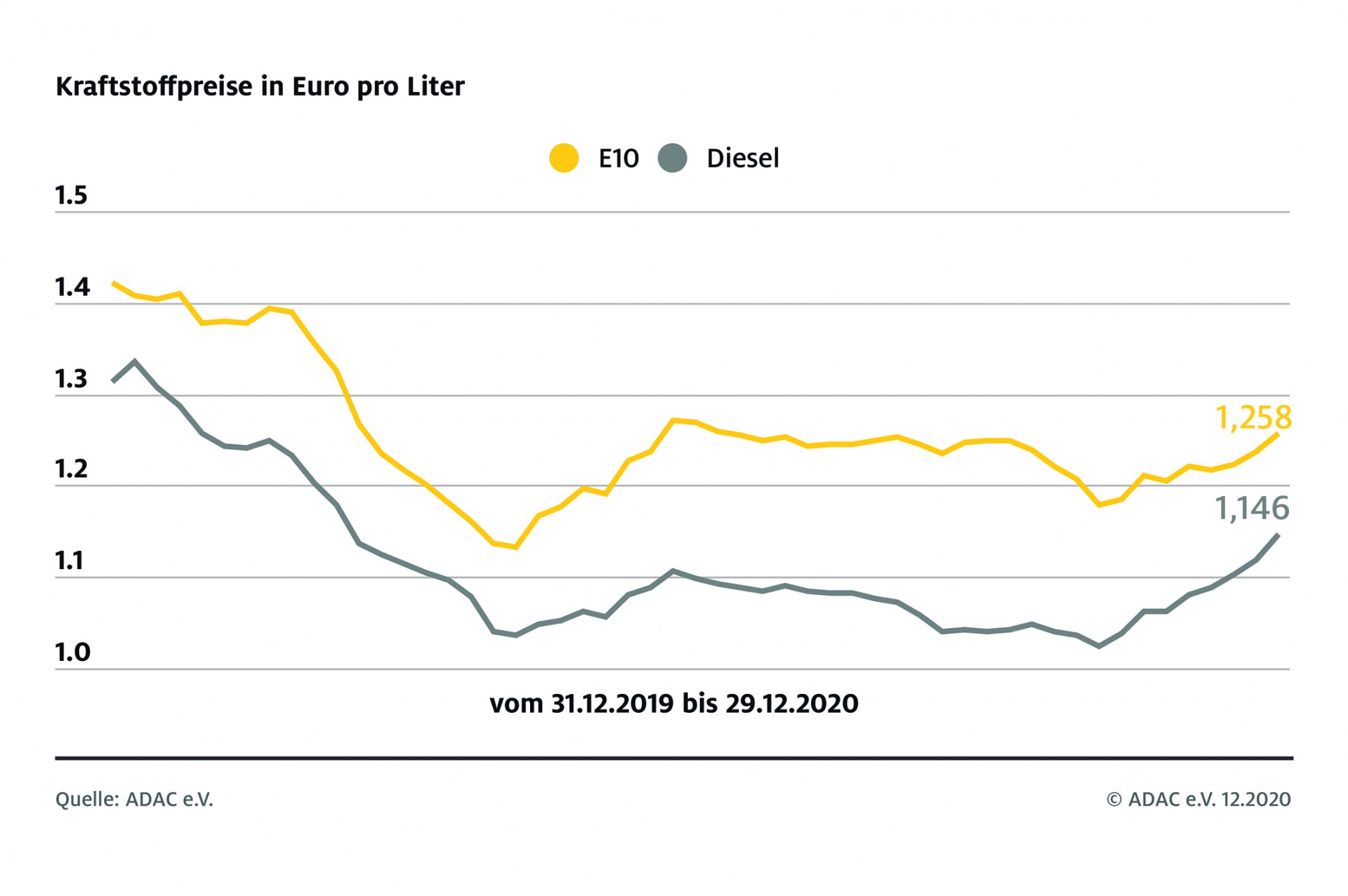 Ursache für den Preisanstieg an der Zapfsäule könnte aus Sicht des ADAC unter anderem die gestiegene Nachfrage zum Jahresende sein: Viele Autofahrer tanken nochmals im alten Jahr, da nach dem Jahreswechsel aufgrund der neuen CO2-Bepreisung und der Rücknahme der Mehrwertsteuersenkung mit Aufschlägen von insgesamt 10 bis 11 Cent je Liter zu rechnen ist.