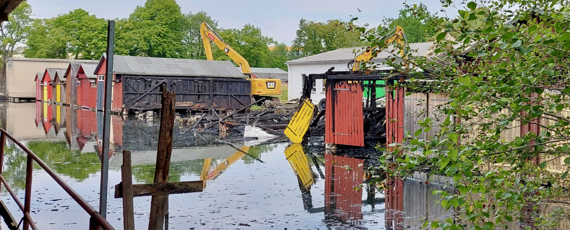 Nach den Bränden in der Bootsschuppenanlage in Neubrandenburg (WsM berichtete) hat die Beräumung begonnen. Zwei große Kräne haben vorn gegenüber des Gebäudes der Müritzfischer und eines Restaurants begonnen, die verkohlten Reste zu bergen. Die Metall- und Holzreste werden in verschiedene Container geladen. Nach Informationen von WsM haben mehrere private Schuppenbesitzer die Initiative ergriffen und tragen zunächst auch die Entsorgungskosten.