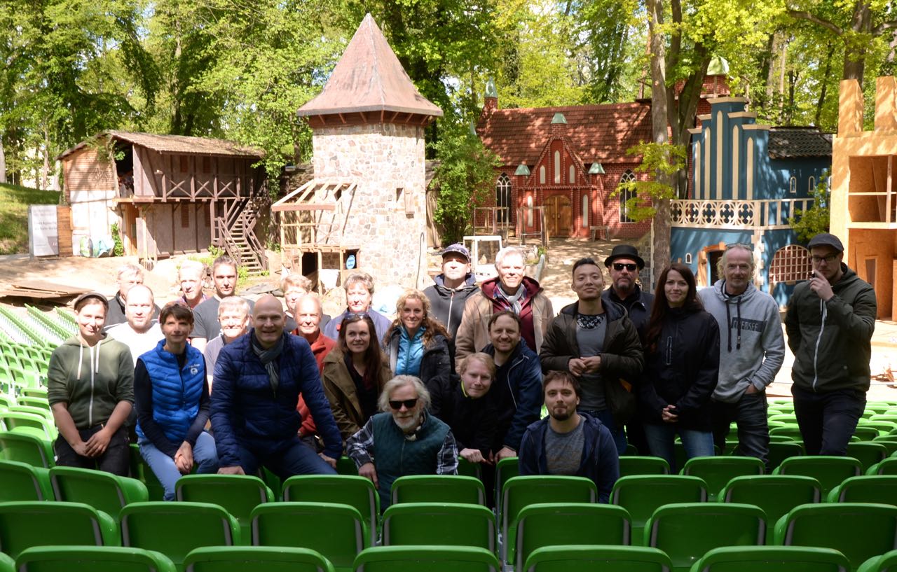 Das ist das diesjährige Schauspieler-Team der Müritz-Saga. Heute haben die Proben begonnen, noch in dieser Woche sollen die ersten Kampfszenen einstudiert werden. Damit das gelingt, klotzen die Handwerker ordentlich ran und haben heute früh beispielsweise das Dach der Kirche aufgesetzt, die so für das Bühnenbild in neuem Glanz erstrahlt.