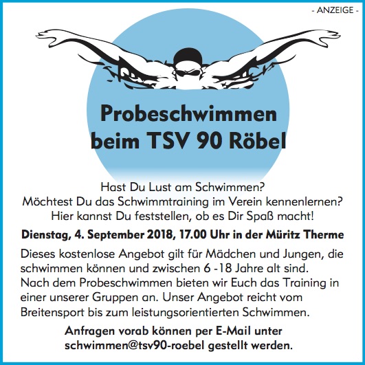 Lust aufs Schwimmen? Der TSV 90 Röbel bietet in der kommenden Woche ein Probeschwimmen an: