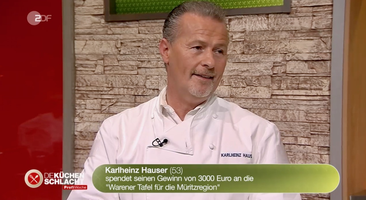 Das ist doch mal eine schöne Überraschung kurz vor dem Jahreswechsel: Bei der ZDF-Küchenschlacht haben in dieser Woche verschiedene Profi-Köche um die Punkte gekocht. Der Sieg ging heute Nachmittag an Sternekoch Karlheinz Hauser. Und der verkündete im ZDF, dass sein Preisgeld in Höhe von 3000 Euro an die Warener Tafel geht.