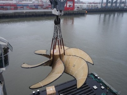 Nach dem aufwendigen Schwertransport vom Produktionswerk in Waren über die Straße nach Hamburg werden die neuen Riesen-Propeller unweit des HHLA Container Terminals Tollerort am Hachmannkai bis zur Verladung zwischengelagert. Ein Schwimmkran, der bis zu 200 Tonnen heben kann, nimmt dann die weltgrößten Propeller auf seine Transportplattform und bringt diese zum Liegeplatz der Schiffe im Waltershofer Hafen. Der Ausleger des Schwimmkrans hebt die Propeller von der Wasserseite aus vorsichtig über die hoch aufragende Bordwand des Schiffes an Bord. Eine heikle Aufgabe, bei der das Schwergewicht Zentimeter für Zentimeter in den Schiffsbauch herabgelassen wird.