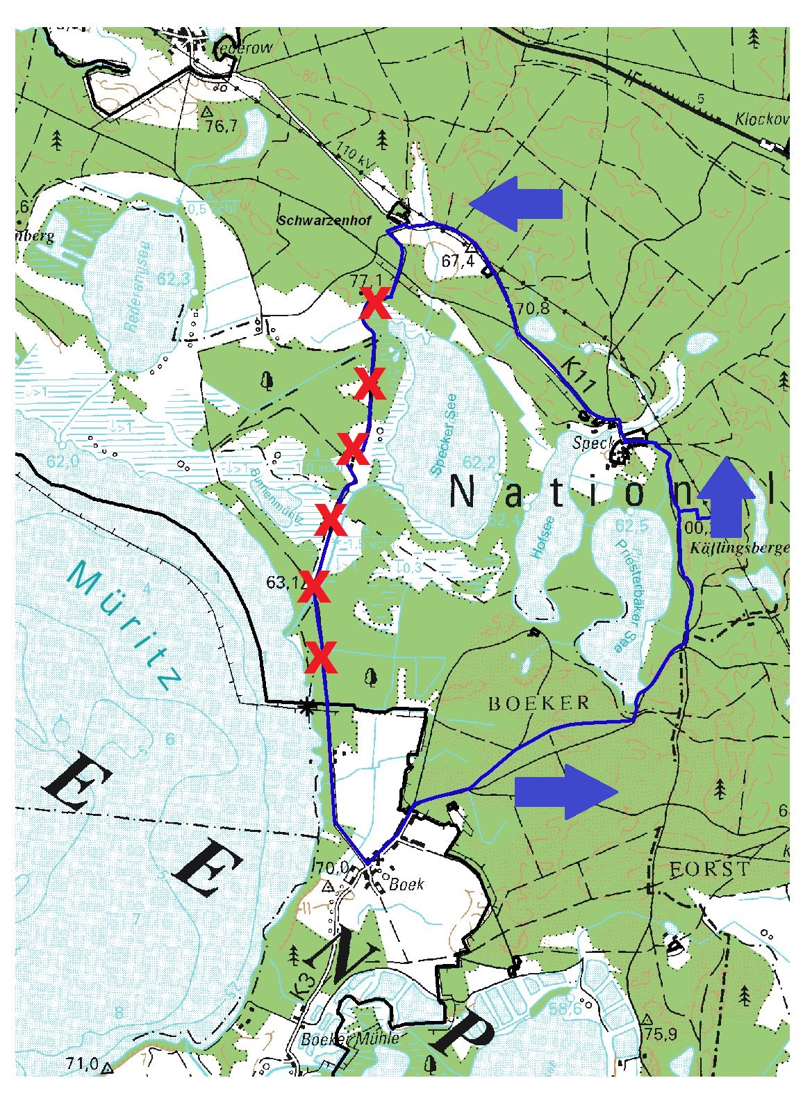 Des Weiteren können die beiden Beobachtungstürme nicht genutzt werden. Der nördliche am Specker See ist wegen Sanierungsarbeiten gesperrt, der südliche an der Binnenmüritz befindet sich innerhalb des gesperrten Radwegebereiches.