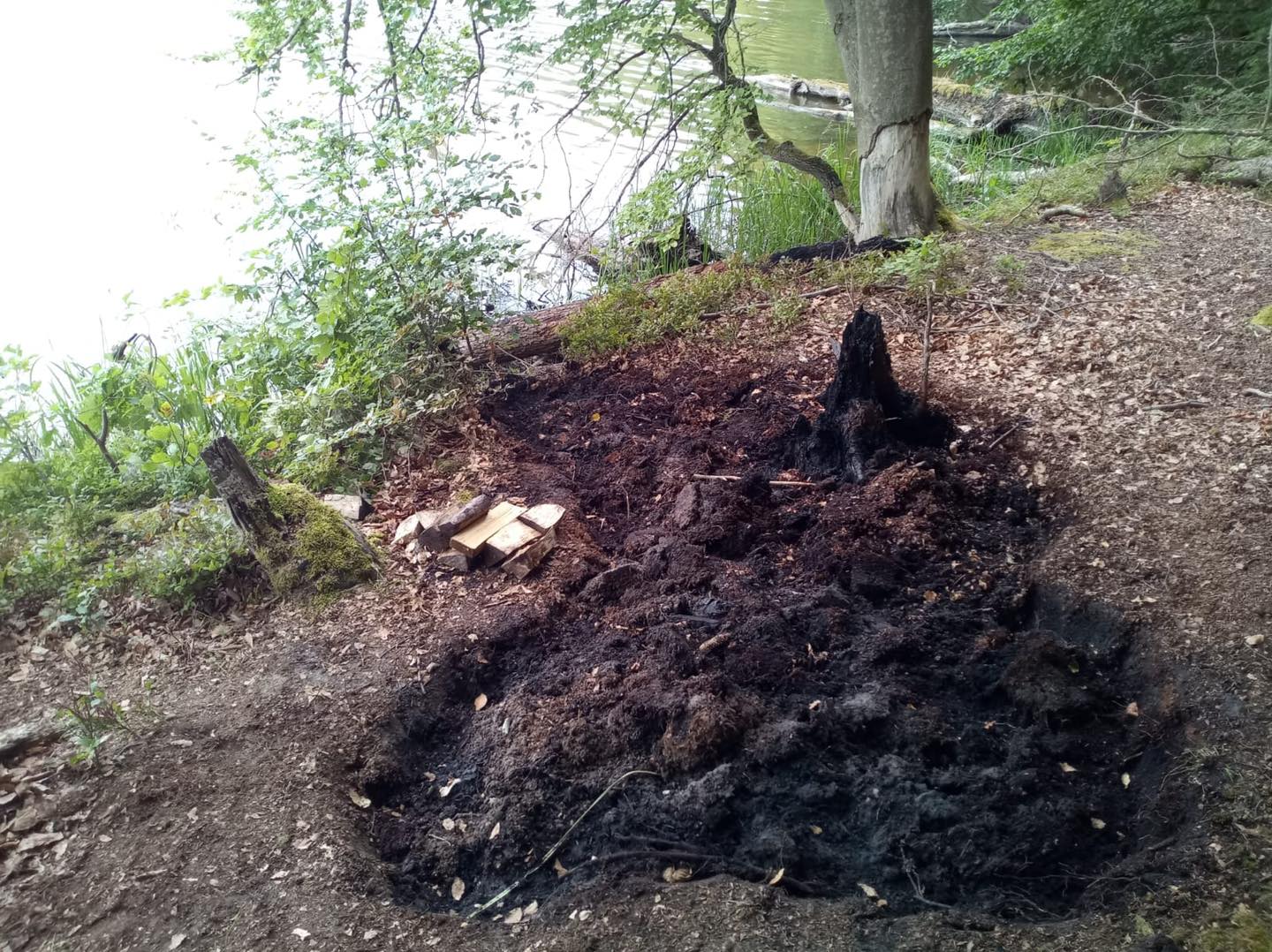 „Ich dachte erst, es handelt sich um einen Fliegenschwarm. Doch es wirkte so ungewöhnlich, dass ich das lieber einmal kontrollieren wollte. Als wir näher kamen, wurde klar: da brennt es,“ erzählt der Ranger. Gemeinsam mit den drei Erwachsenen und fünf Kindern, die bei der Führung mit dabei waren, beschlossen sie, anzulegen und genauer nachzuschauen. Und tatsächlich: Um eine alte Buchenwurzel herum hatte sich von einer menschgemachten Feuerstelle aus ein Erdbrand ausgebreitet.