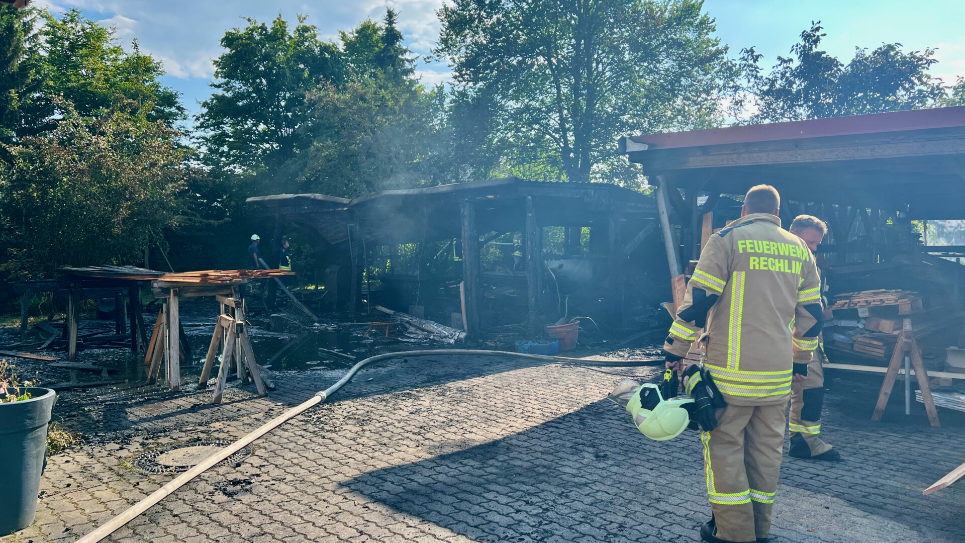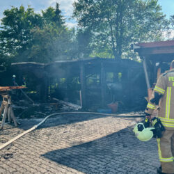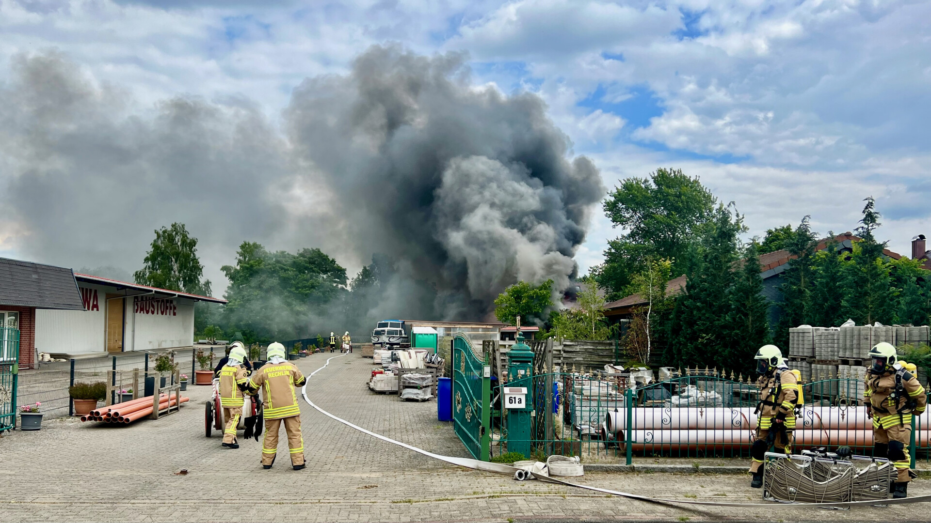 Großeinsatz heute Nachmittag für mehrere Feuerwehren in Rechlin. In einer Lagerhalle an einem Baumarkt war ein Brand ausgebrochen, die Flammen griffen auf ein daneben stehendes, aber nicht bewohntes Einfamilienhaus über. Die beiden Besitzer des Grundstücks waren bei Brandausbruch noch auf dem Hof. Sie konnten das Grundstück unverletzt verlassen, nachdem es zu einer starken Rauch- und Flammenbildung innerhalb der Lagerhalle kam. Auch dort gelagerte Gasflaschen konnten sie noch aus dem Gefahrenbereich beringen. Das Feuer griff auf das angrenzende leerstehende Wohnhaus über. Der entstandene Sachschaden beträgt ca. 50.000 Euro. Die Freiwilligen Feuerwehren aus Rechlin, Krümmel, Lärz und Vipperow waren mit insgesamt 40 Kameraden im Einsatz. Die Kriminalpolizei hat vor Ort die Ermittlungen zur Brandursache aufgenommen.