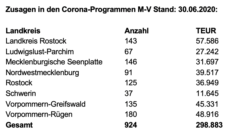 Seit Beginn der Corona-Pandemie hat die staatliche KfW-Bankengruppe fast 68.000 Unternehmen unterstützt. Für das Land Mecklenburg-Vorpommern sind seit Beginn der KfW-Corona-Hilfen am 23. März 2020 bis Ende Juni Zusagen für ca. 924 Kredite in Höhe von 299 Millionen Euro erteilt worden. Das erklärte der CDU-Bundestagsabgeordnete Eckhardt Rehberg.