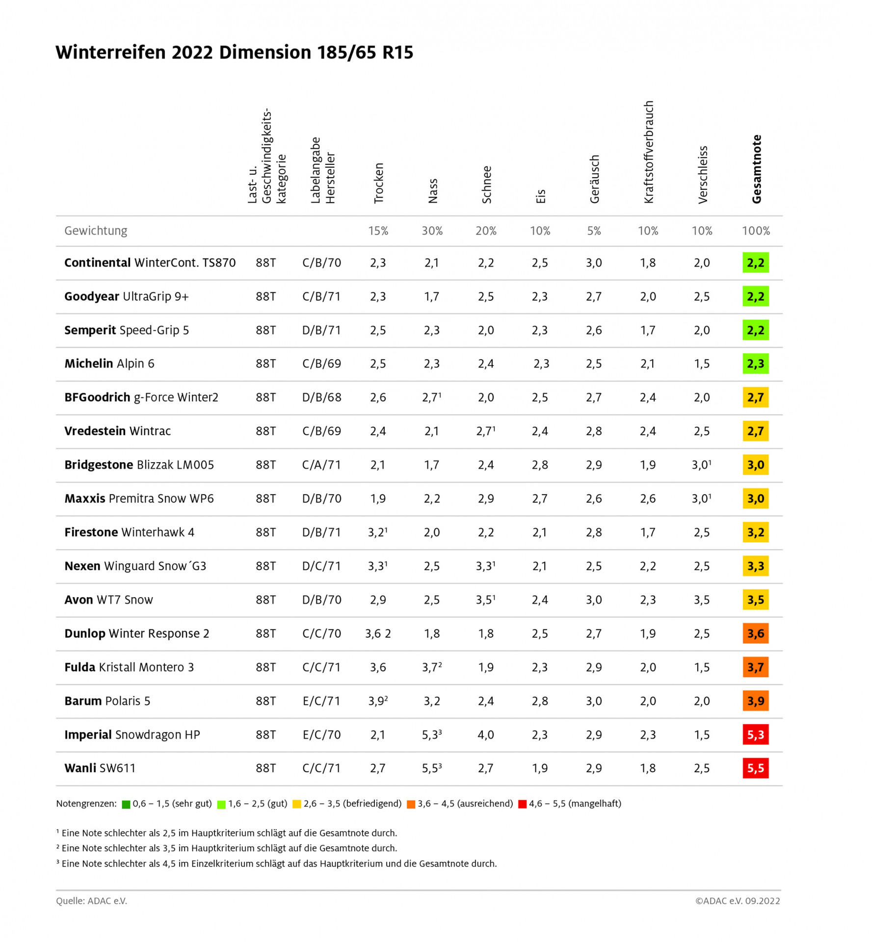 In der Dimension 185/65 R15 (T) für VW Polo, Audi A1 oder Opel Corsa sind die Reifen von Continental, Goodyear, Semperit und Michelin sehr ausgewogen, zeigen insbesondere auf Nässe, Schnee und trockener Fahrbahn gute Leistungen und bekommen daher das ADAC Urteil „gut“. Danach folgt ein breites Mittelfeld, das mit wachsenden Einschränkungen parallel zu den absteigenden Platzierungen empfohlen werden kann. Hier spart ein genauer Blick in die Ergebnistabelle bares Geld, denn in dieser Dimension sind die guten Reifen nicht sehr viel teurer als die Modelle mit Einschränkungen.