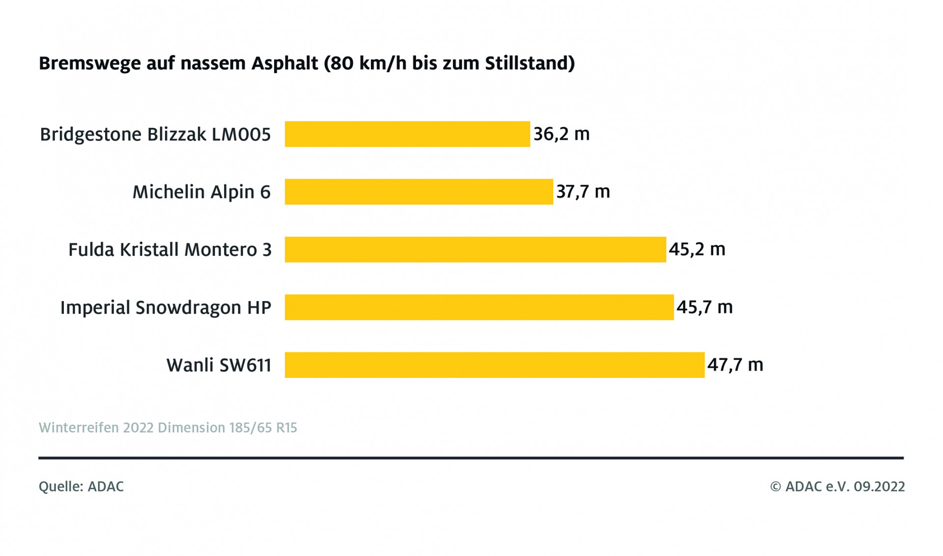 Die Modelle von Imperial und Wanli fallen mit „mangelhaft“ durch. Die ADAC Tester raten von diesen in China produzierten Reifen ab, weil sie auf Nässe extrem schlecht abschneiden: Deren Bremsweg aus 80 Stundenkilometern ist rund 10 Meter länger als der des Erstplatzierten Bridgestone (36,2 Meter).