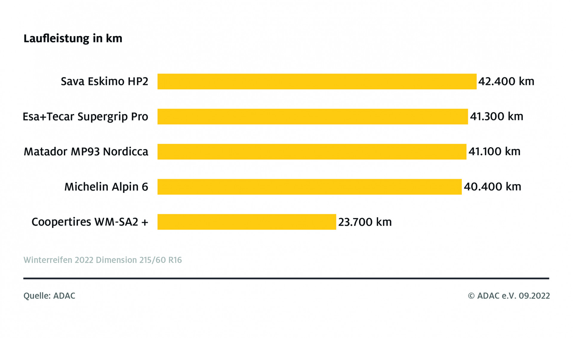 Schlusslicht mit einem „ausreichend“ ist das Modell von Coopertires, das u.a. die schlechteste Trockenperformance zeigt, weil sich der Fahrradius im Kurvenverlauf ändert und der Fahrer Probleme hat, das Auto zu stabilisieren und in die Ursprungsrichtung zu lenken. Hinzu kommt, dass dieser Reifen beim Verschleißtest mit Abstand am schlechtesten abschneidet: Er erreicht mit knapp 24.000 Kilometer Laufleistung rund 19.000 Kilometer weniger als der Spitzenreiter Sava.