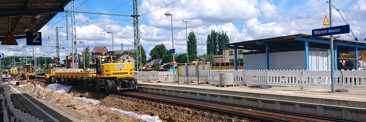 Während die Bauarbeiten auf den Hauptgleisen und -Bahnsteigen 1 und 2 laufen, müssen alle Zuggäste auf den Bahnsteig 3 ausweichen. Das bedeutet, dass mitunter ein Bagger an einem Graben arbeitet, während die Bahn Durchsagen macht. Oder eine Lok oder ein Triebwagen lassen ihre Motoren laufen.