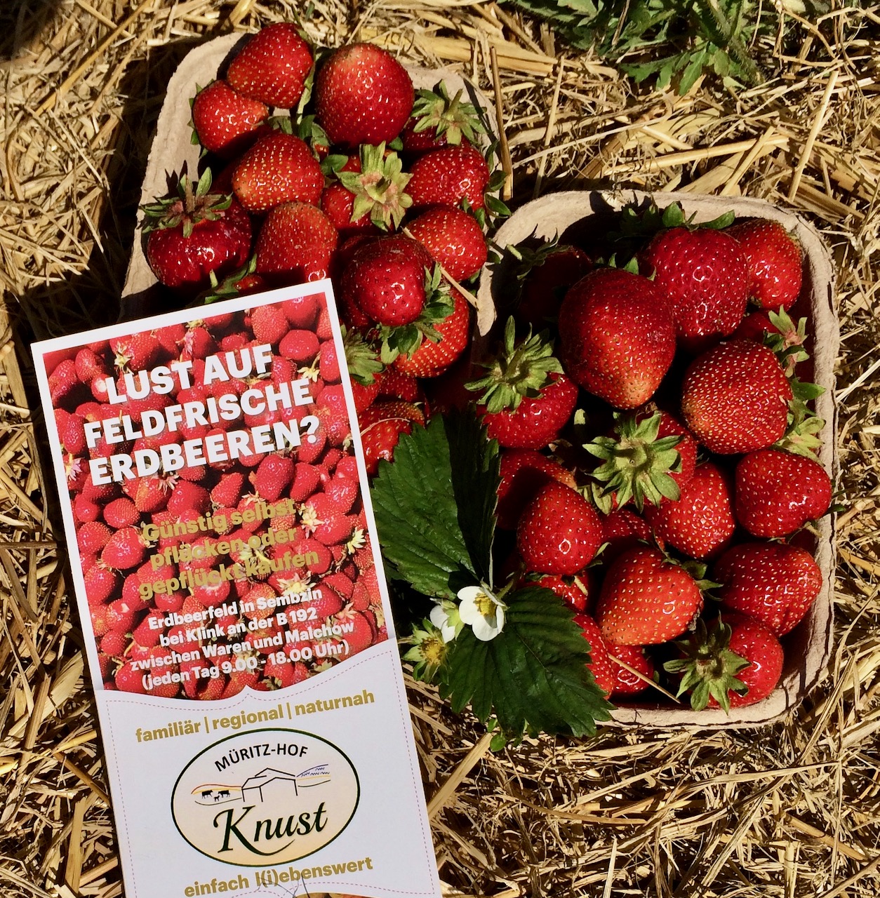 Egal ob für Kuchen, Eis, Marmelade oder einfach zum Naschen … jetzt ist die beste Zeit, um in Rekordzeit einen ganzen Korb oder Eimer mit leckeren sonnengereiften Erdbeeren zu pflücken. Verschiedene leckere Sorten sind reif und laden zum Probieren und Pflücken ein. Also ab nach Sembzin zum Erdbeer-Selbstpflückfeld, direkt an der B 192 auf Höhe Sembzin zwischen Waren und Malchow. Behälter dürfen gerne mitgebracht werden. Pflücken natürlich mit Einhaltung der Abstands- und Hygieneregeln.