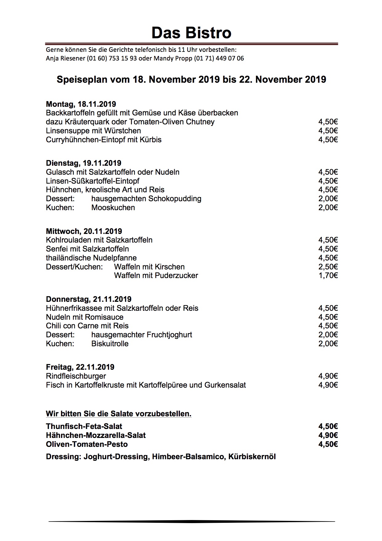 Montag, kurz nach 9 Uhr – Zeit, schon mal zu schauen, was es zu Mittag gibt. Hier ist der aktuelle Speiseplan für „Das Bistro“ am Warener Amtsbrink: