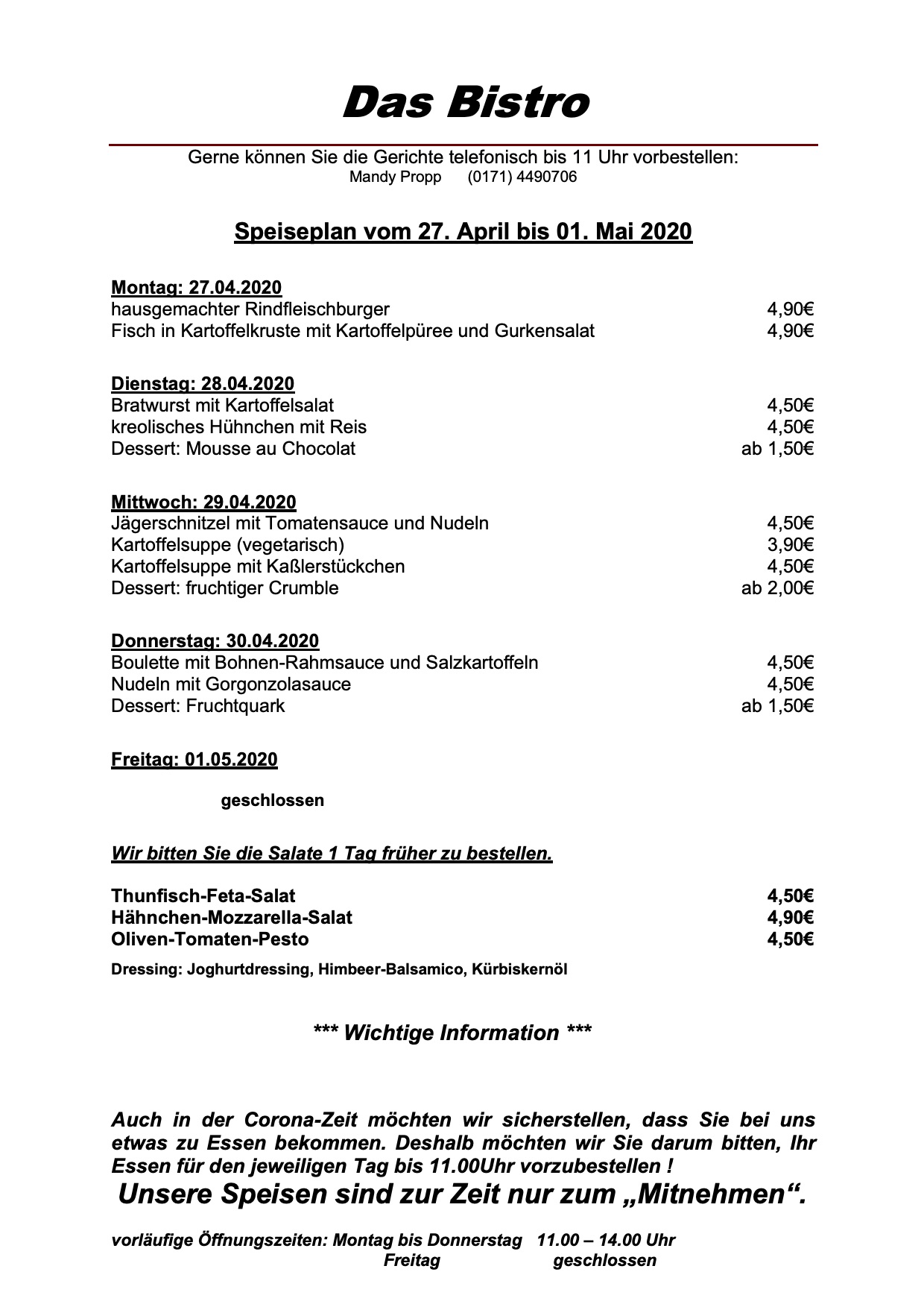 Die verkürzte Woche – Freitag ist Feiertag – beginnt im „Das Bistro“ am Warener Amtsbrink mit hausgemachten Rindfleischburgern sowie Fisch in Kartoffelkruste.