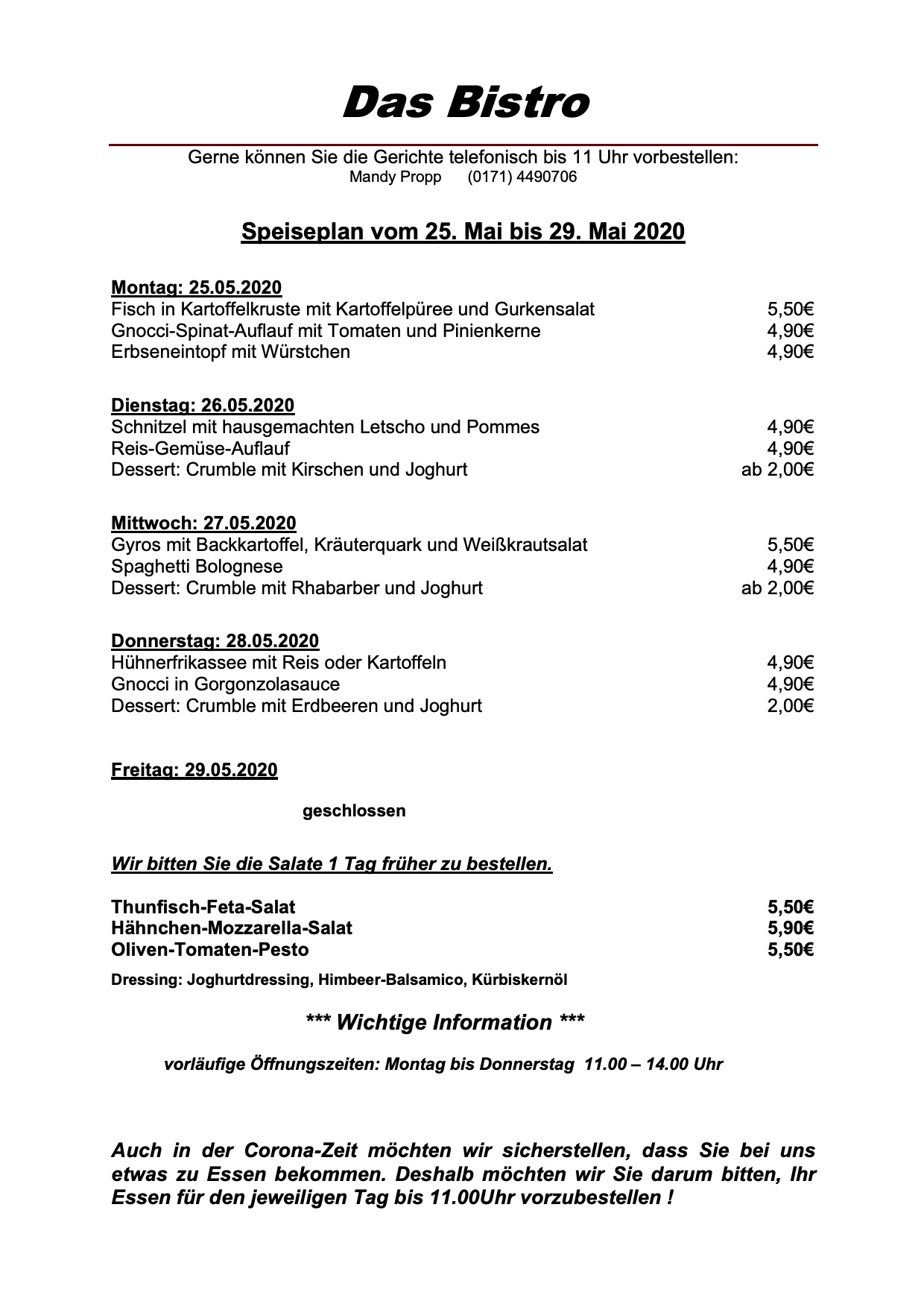 Hier der Speiseplan für diese Woche: