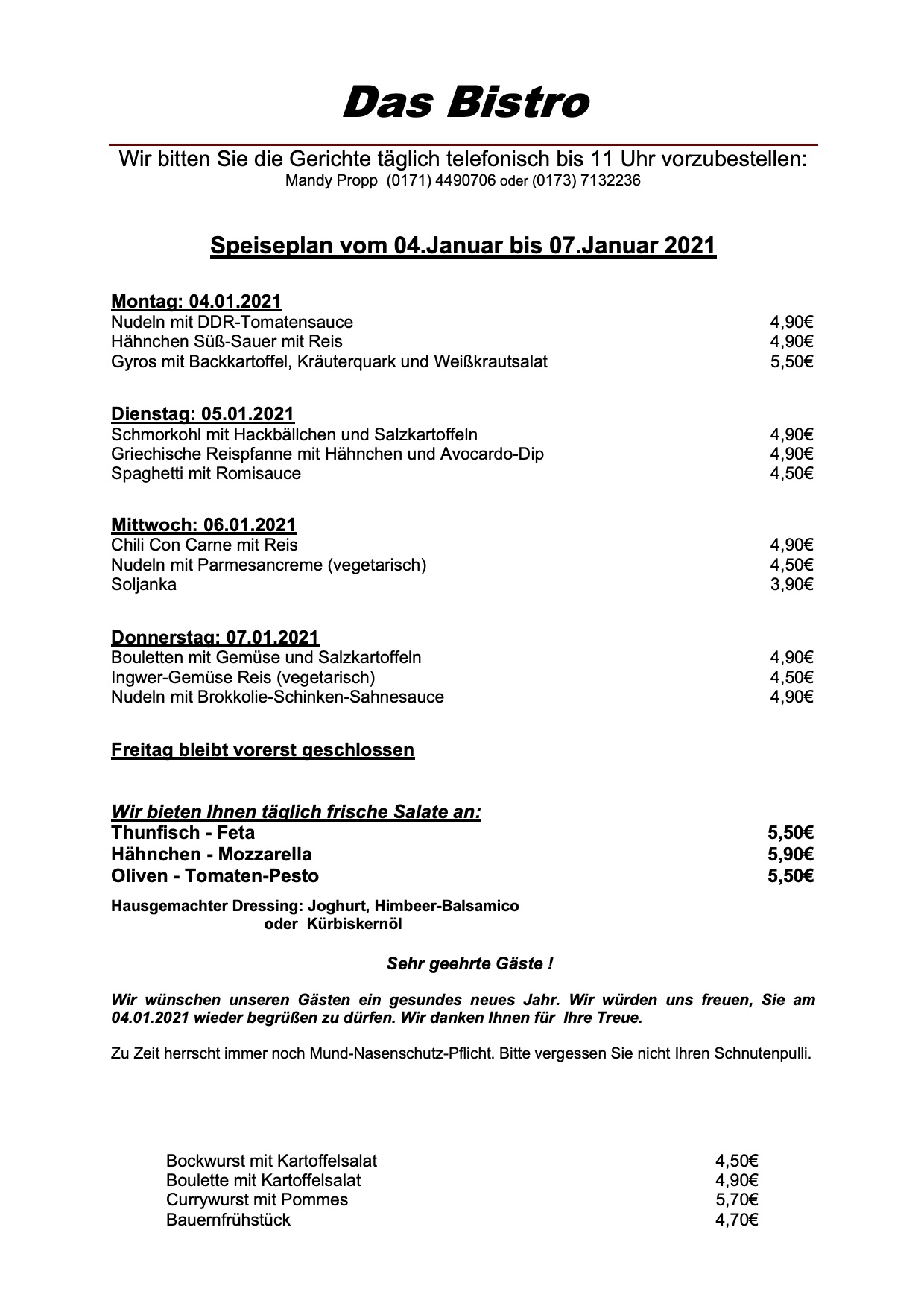Das neue Jahr beginnt in „Das Bistro“ am Warener Amtsbrink mit Nudeln in DDR-Tomatensoße, Hähnchen süß-sauer mit Reis sowie Gyros mit Backkartoffel und Kräuterquark.