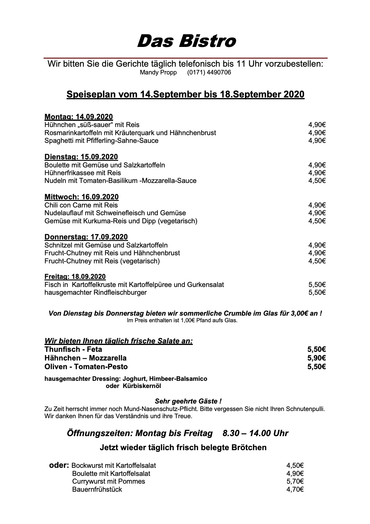 Hier der Speiseplan für diese Woche für „Das Bistro“ am Warener Amtsbrink: