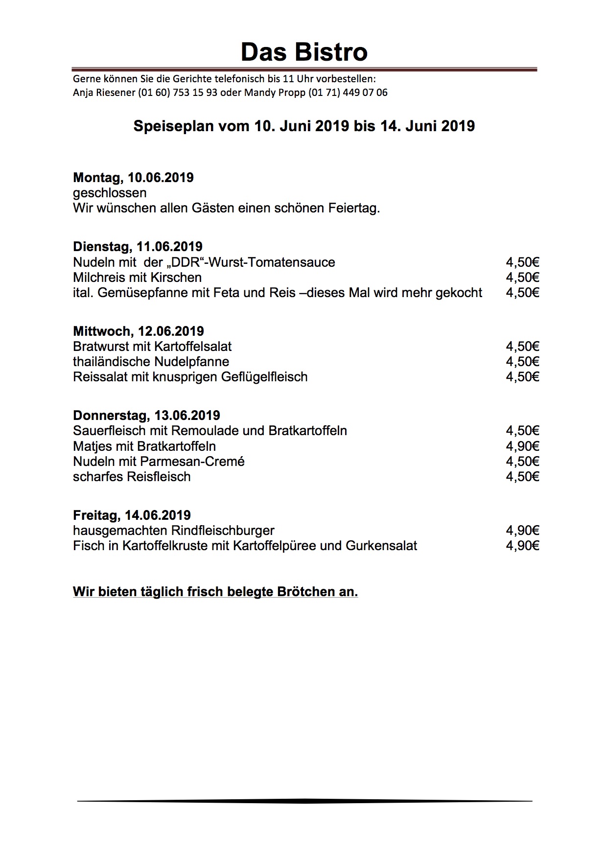 Hier der Speiseplan für diese etwas verkürzte Woche: