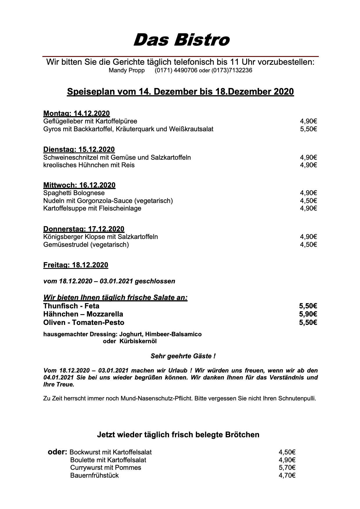 Zum letzten Mal in diesem Jahr gibt’s den wöchentlichen Speiseplan für „Das Bistro“ am Warener Amtsbrink, denn ab dem 18. Dezember wird Urlaub gemacht gemacht.