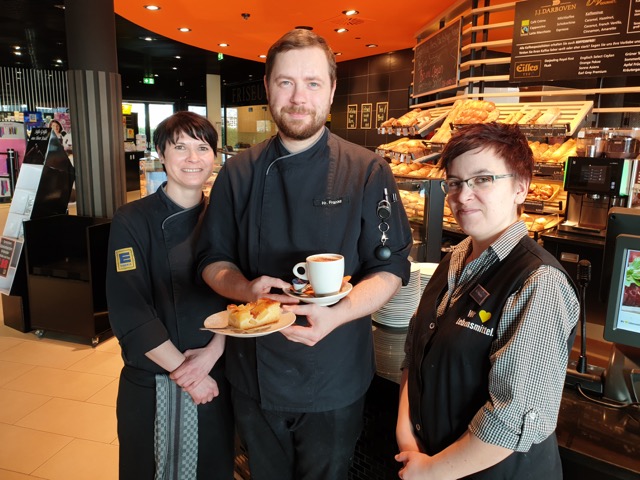 Bistrochef Christian Franke sowie Fachverkäuferin Maria Päpcke und Köchin Christin Förster haben in dieser Woche einen besonderen Tipp: 1 Stück lecker hausgemachter Kuchen – Apfel oder Kirsche – und eine Kaffee-Spezialität