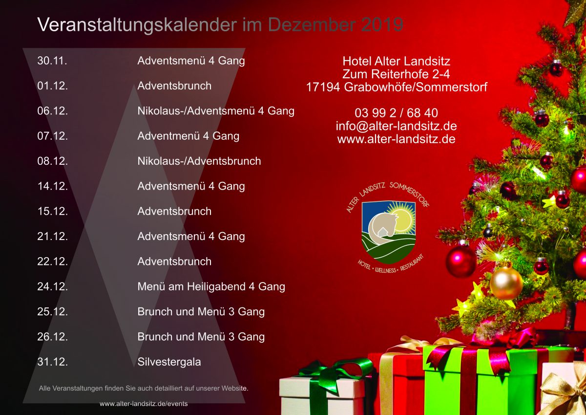 Der Alte Landsitz Sommerstorf und sein Team wollen Sie ganz ohne Stress durch die Vorweihnachtszeit bringen und Ihnen kleine Momente der Ruhe und Gemütlichkeit ermöglichen. Genießen Sie besinnliche Stunden bei einem 4-Gänge-Menü mit Ihrer Liebsten oder Ihrem Liebsten, entspannen Sie und atmen Sie einfach mal durch. Gern verwöhnen wir Sie auch in unserem Wellnessbereich.