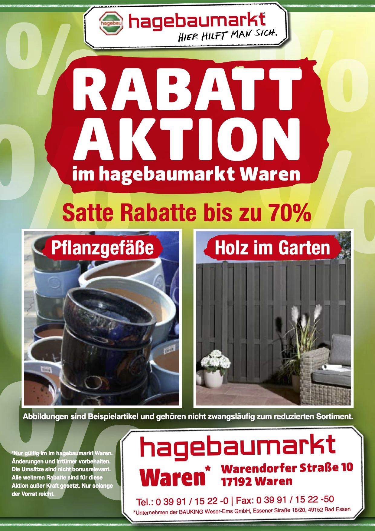 Der Hagebaumarkt Waren hält viele Angebote für seine Kunden bereit. Besonders im Bereich Holz im Garten (z.B. Hochbeete, Gerätehäuser, Spielhäuser oder Pflanzkübel und Rankgitter) und auch bei den Pflanzgefäßen (z.B. Keramik- oder Kunststoff-Outdoorgefäße in verschiedenen Farben und Größen) wird kräftig reduziert, um Platz für die neue Ware der Saison 2021 zu schaffen.