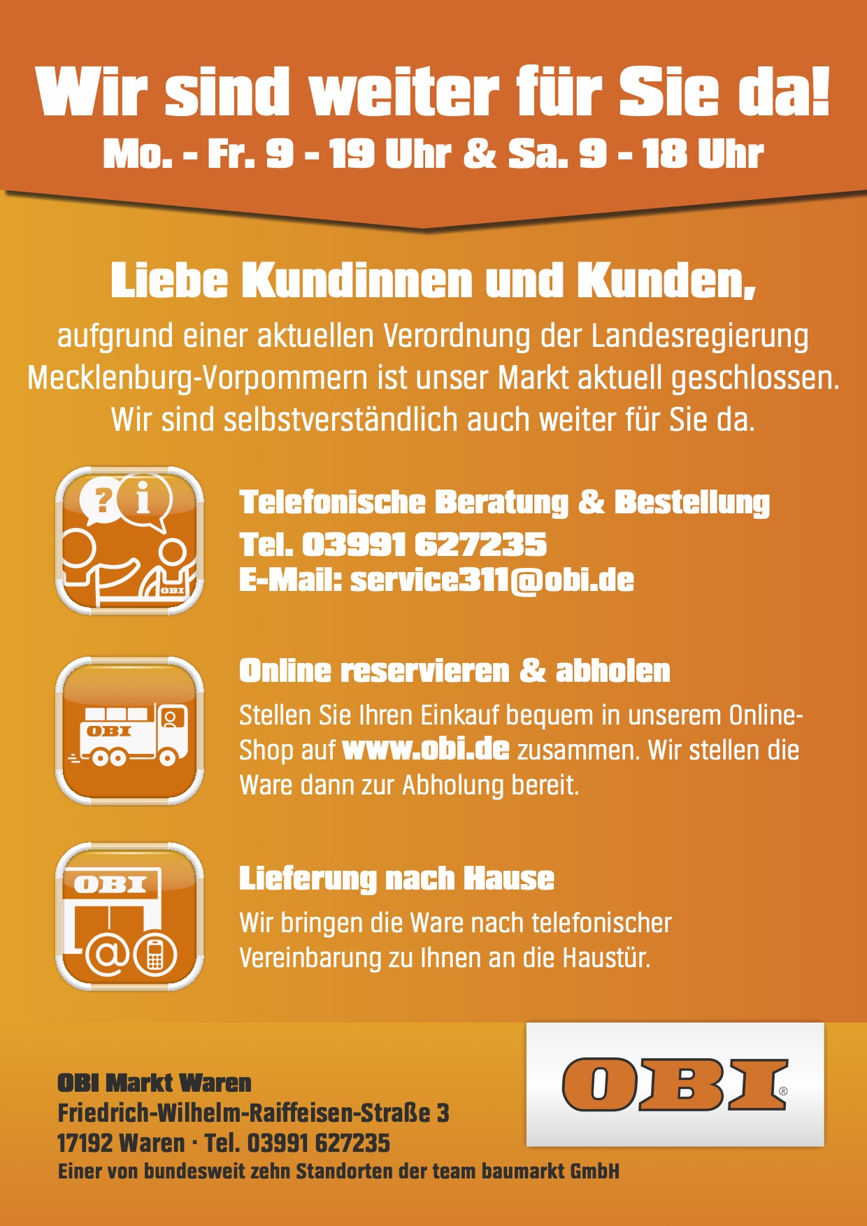 Auch der Warener OBI-Markt bietet ab sofort telefonische Beratung und Bestellungen sowie die Lieferung nach Hause an.