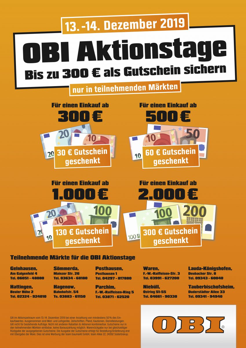 Kleine Erinnerung: Auch der Warener OBI-Markt macht bei dieser einmaligen Aktion, die nur heute und morgen gilt, mit: