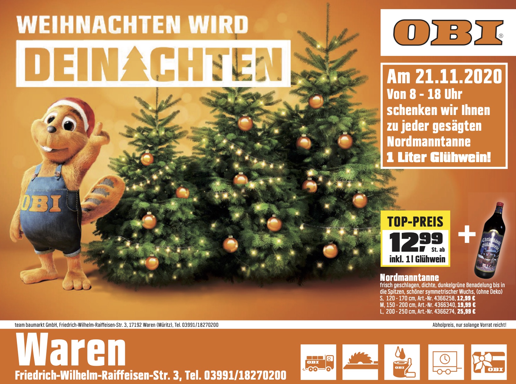 Am heutigen Sonnabend können die Kunden zudem eine frisch geschlagene Nordmanntanne für das heimische Wohnzimmer oder das Büro kaufen – Gratis dazu gibt’s eine 1-Liter-Flasche Glühwein.