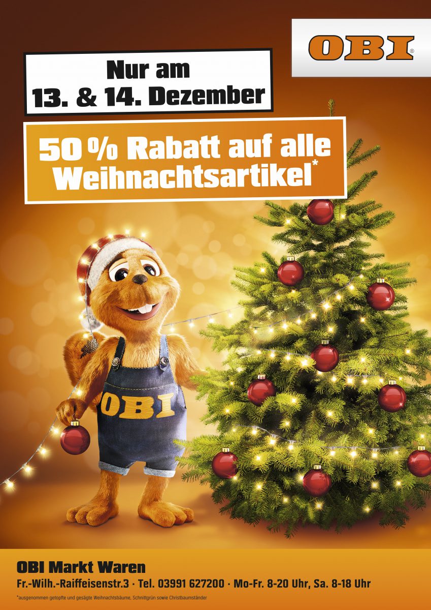 Nicht nur Aktionstage bei OBI in Waren, morgen und am Sonnabend gibt’s auf alle Weihnachtsartikel auch noch 50 Prozent Rabatt: