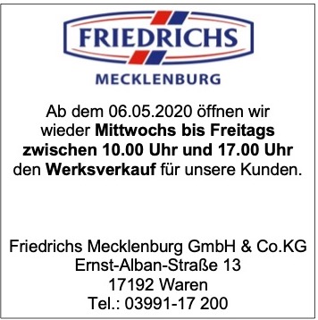 Gute Nachrichten für Fischfreunde, die regelmäßig den Werksverkauf bei Friedrichs in Waren nutzen: Ab morgen geht’s wieder los: Von mittwochs bis freitags können die Kunden in der Ernst-Alban-Straße 13 wieder beim Werkverkauf „zuschlagen“.