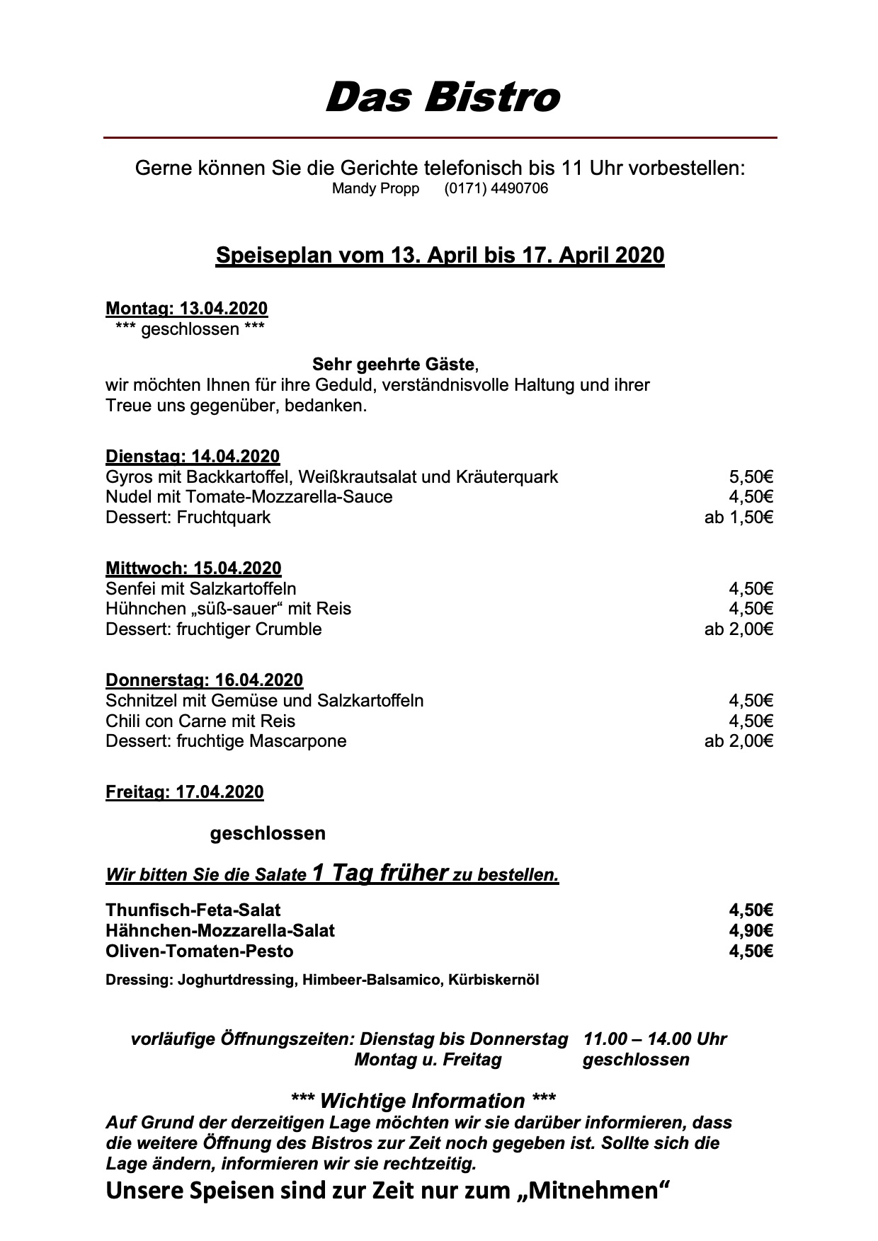 Hier der aktuelle Speiseplan für „Das Bistro“ am Warener Amtsbrink: